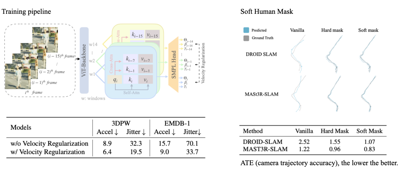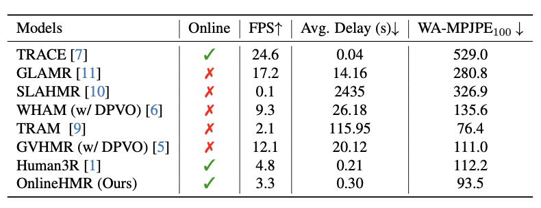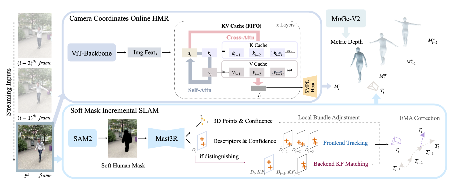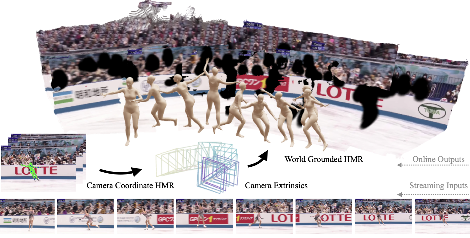 Given a streaming video as input, OnlineHMR recovers the world coordinates human mesh and camera trajectory in an online manner.