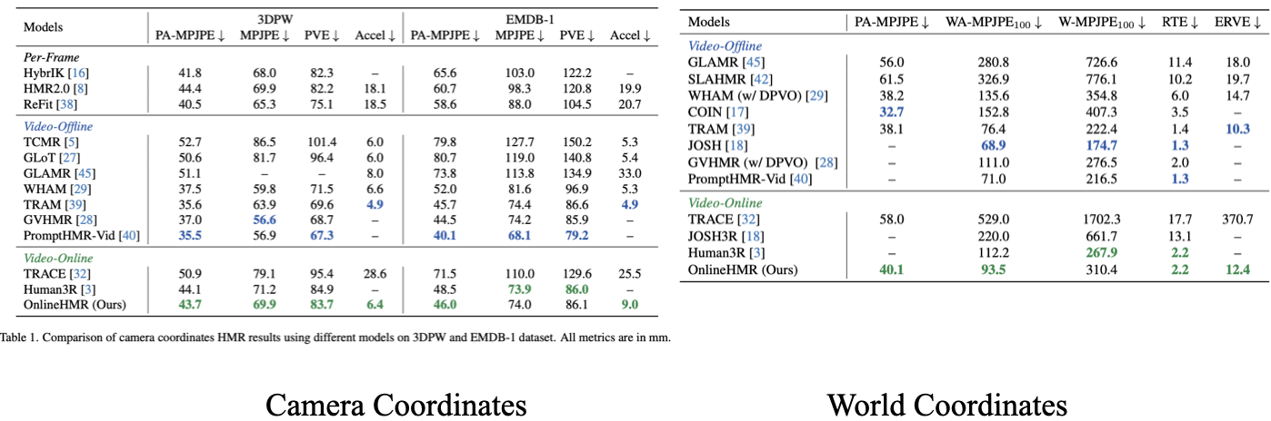 Quantitatively, we compare our result with previous and concurrent offline/online methods on the camera coordinate benchmark 3DPW and EMDB1, and world coordinate benchmark EMDB2. Qualitatively, we test our method on custom art and sports videos.